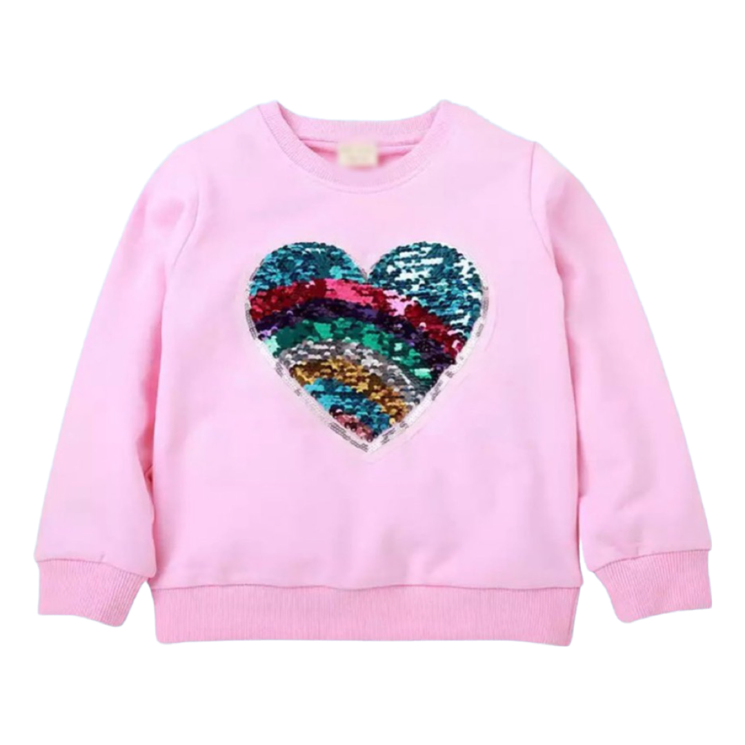 Sudadera en color rosa con detalle de corazón multicolor en lentejuelas.