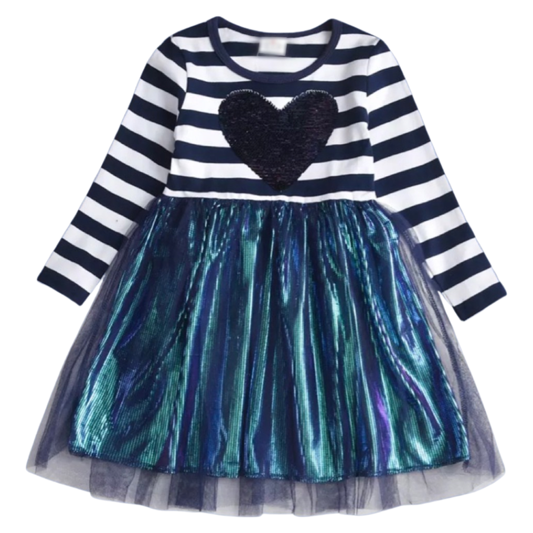 Vestido con top en rayas blanco y marino, detalle de corazón en lentejuelas y falda en azul tornasol.