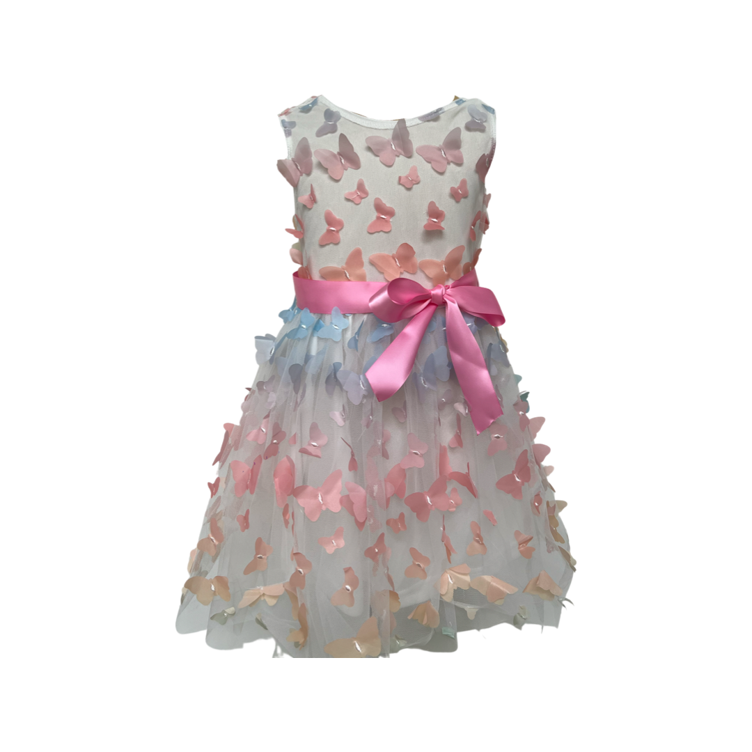 Vestido blanco con aplicación de mariposas 3D en diferentes colores.