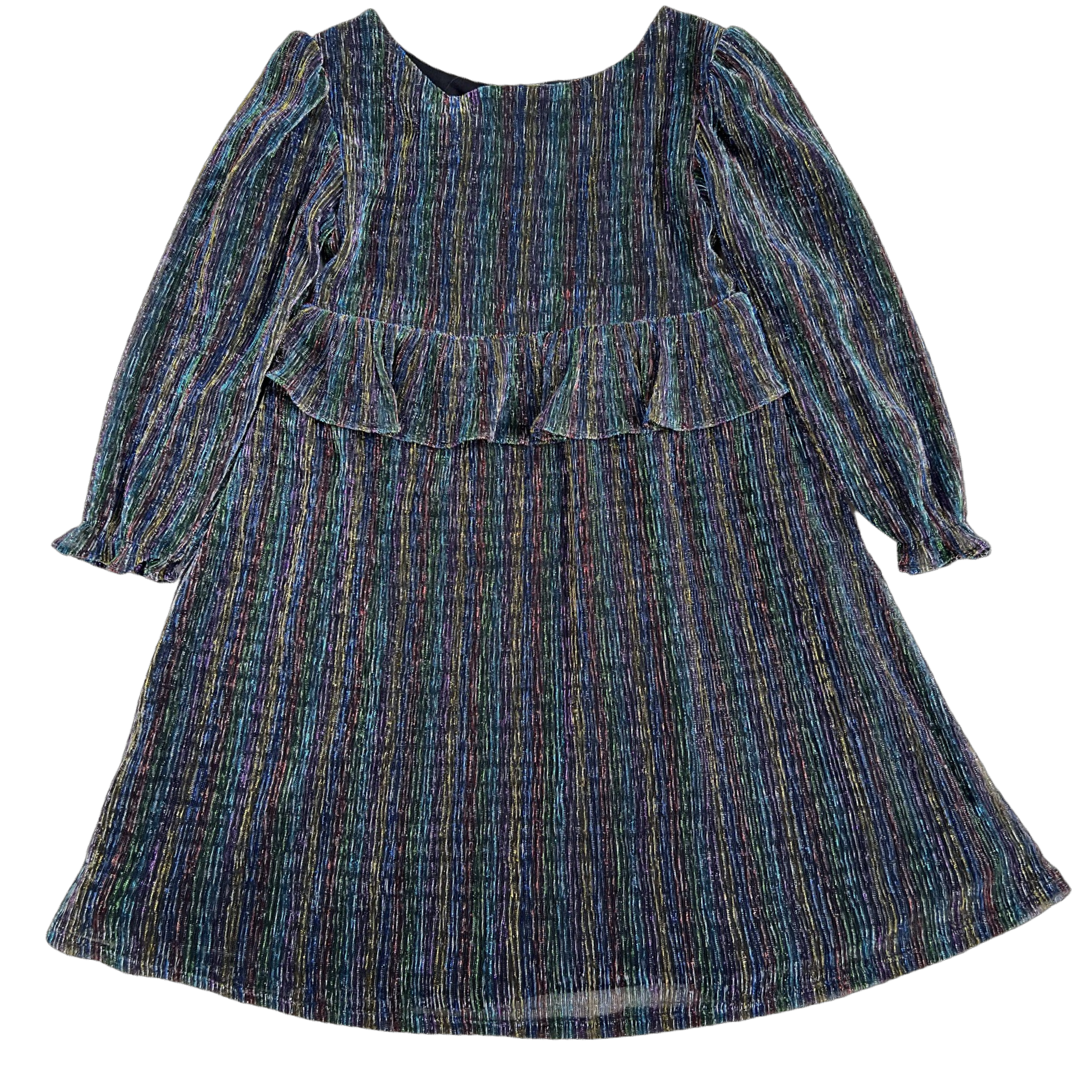 Vestido de manga larga en tonos oscuros y detalles tornasol estilo rainbow.