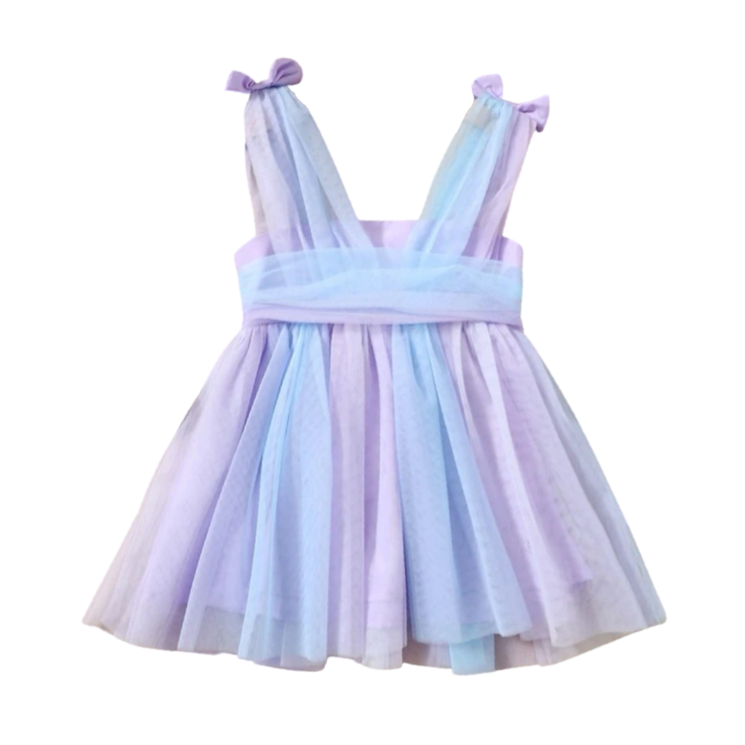 Vestido de tul lila con celeste, aplicación de moños en tirantes.