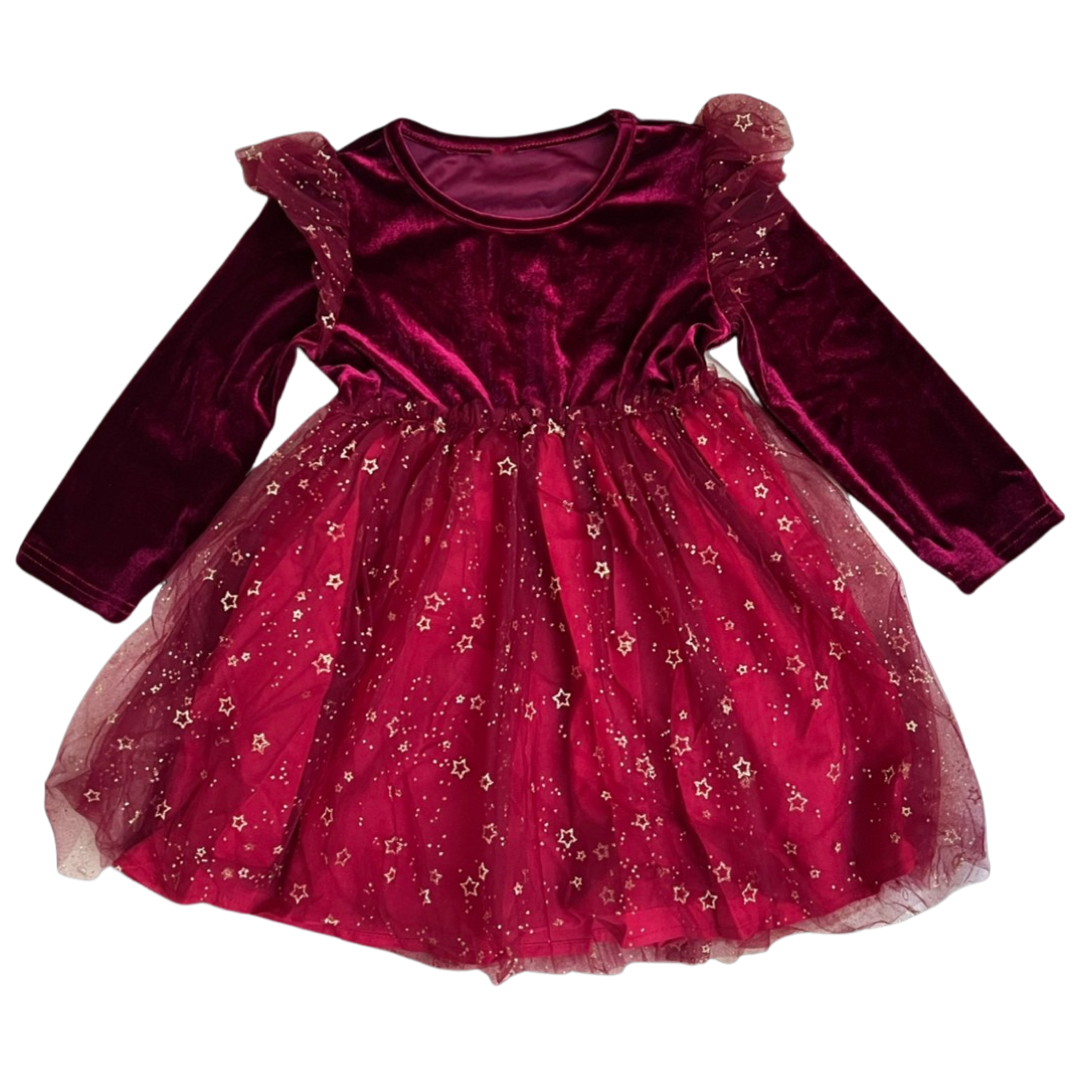 Vestido velvet rojo con tul y detalle de estrellas doradas.